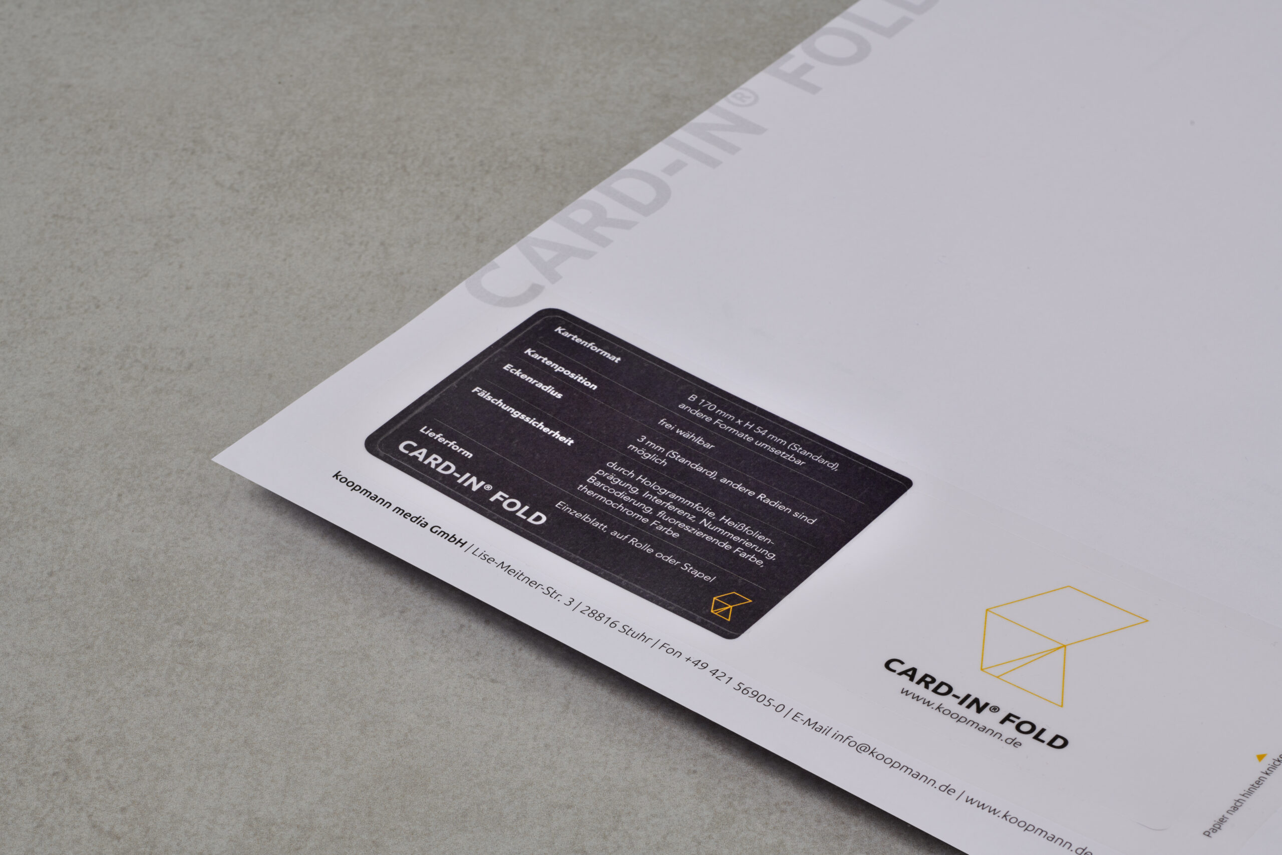 Manchmal braucht es mehr als nur Standard, um wirklich zu beeindrucken. Mit integrierten Karten Card-in® bietet Ihnen koopmann media eine hochmoderne Lösung, die die Grenzen des konventionellen Drucks sprengt. Dabei wird eine hochwertige Karte direkt in ein Dokument, einen Flyer oder ein anderes Druckprodukt integriert und anschließend mit herausragenden Veredelungstechniken bearbeitet. Diese Methode ermöglicht eine einzigartige Kombination aus Informationsträger und physischem Mehrwert, der Ihre Zielgruppe sofort anspricht und einen bleibenden, exklusiven Eindruck hinterlässt. Perfekt für all jene, die sich von der Masse abheben und höchste Wertigkeit vermitteln möchten.