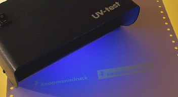 Fluoreszierende Farben (auch „Schwarzlicht-“ oder „UV-Farben“) leuchten nur bei UV-Licht, ansonsten sind sie unsichtbar. Sie werden vor allem als Sicherheitselement eingesetzt und sind mit weiteren Sicherheitslösungen kombinierbar.